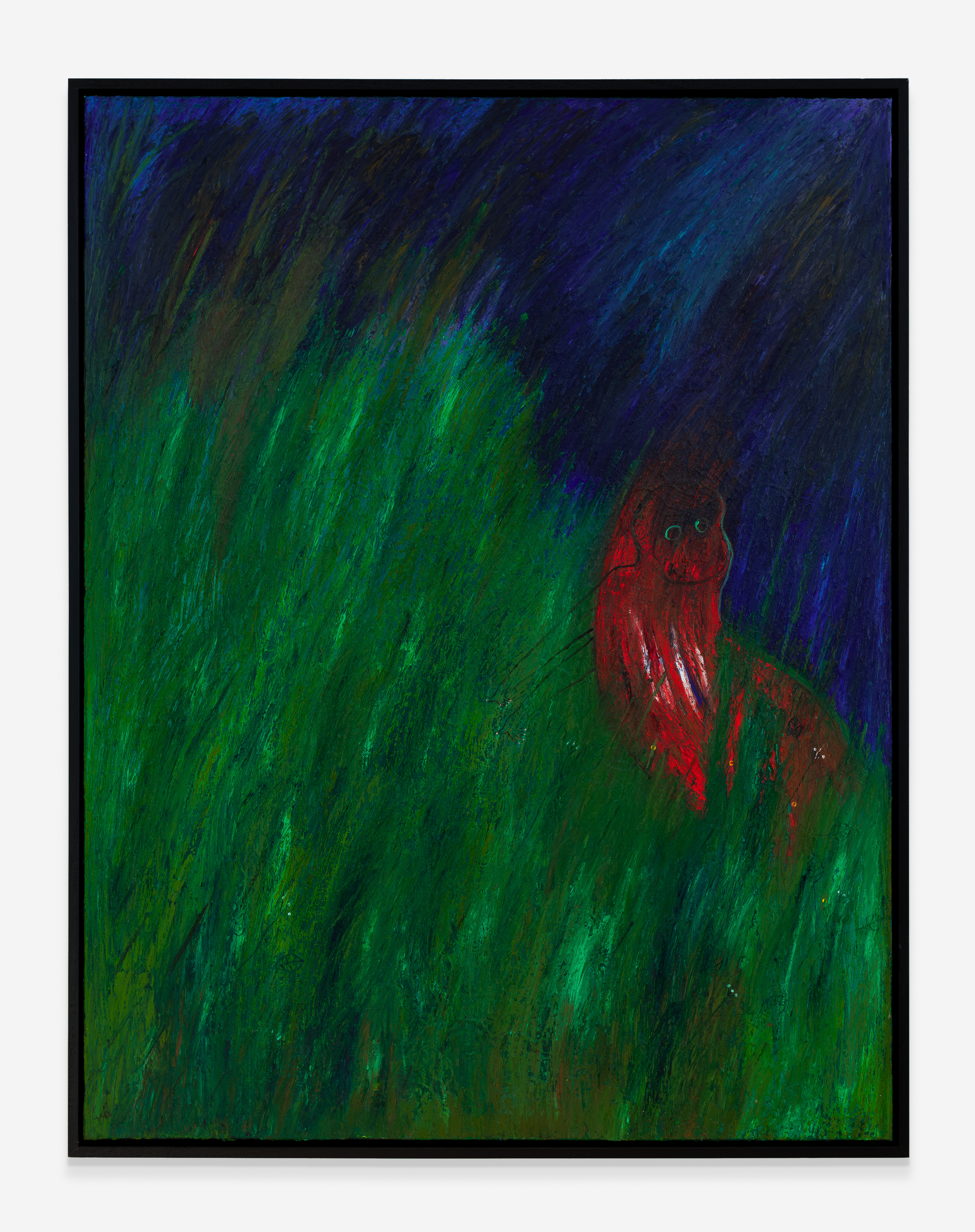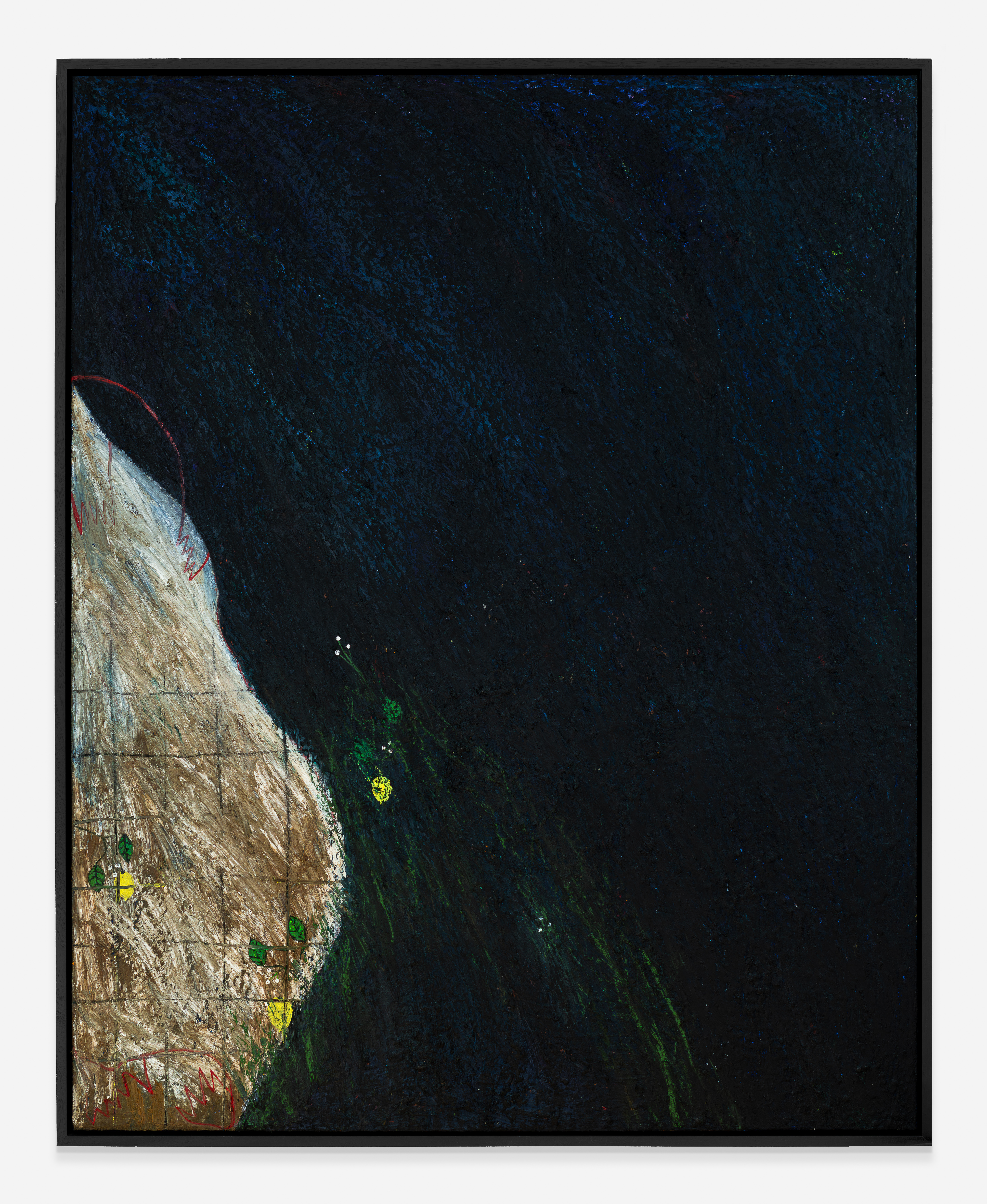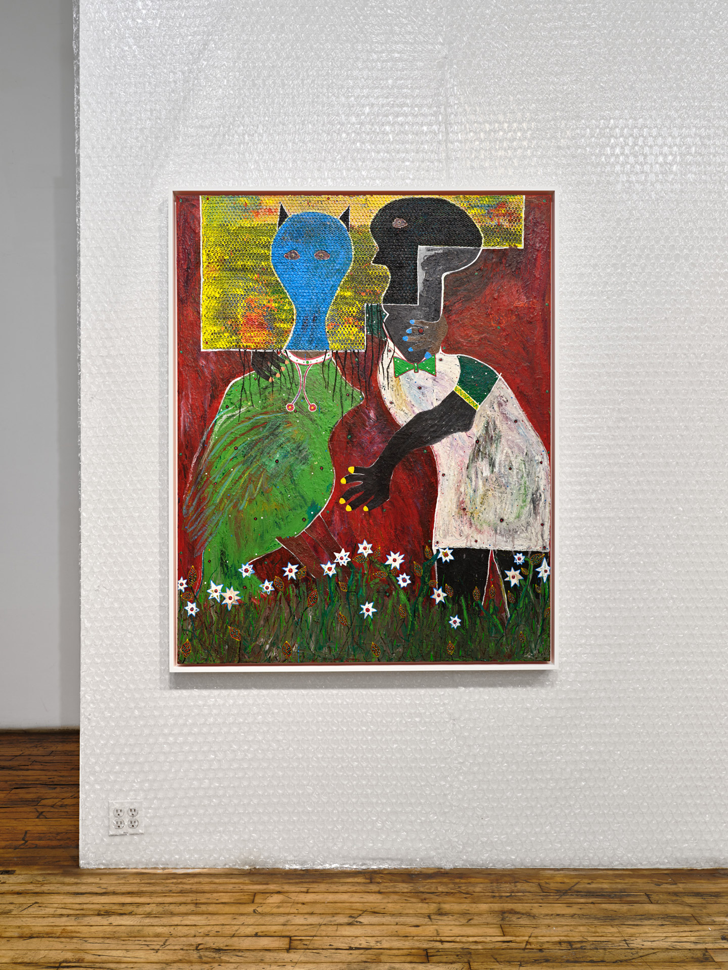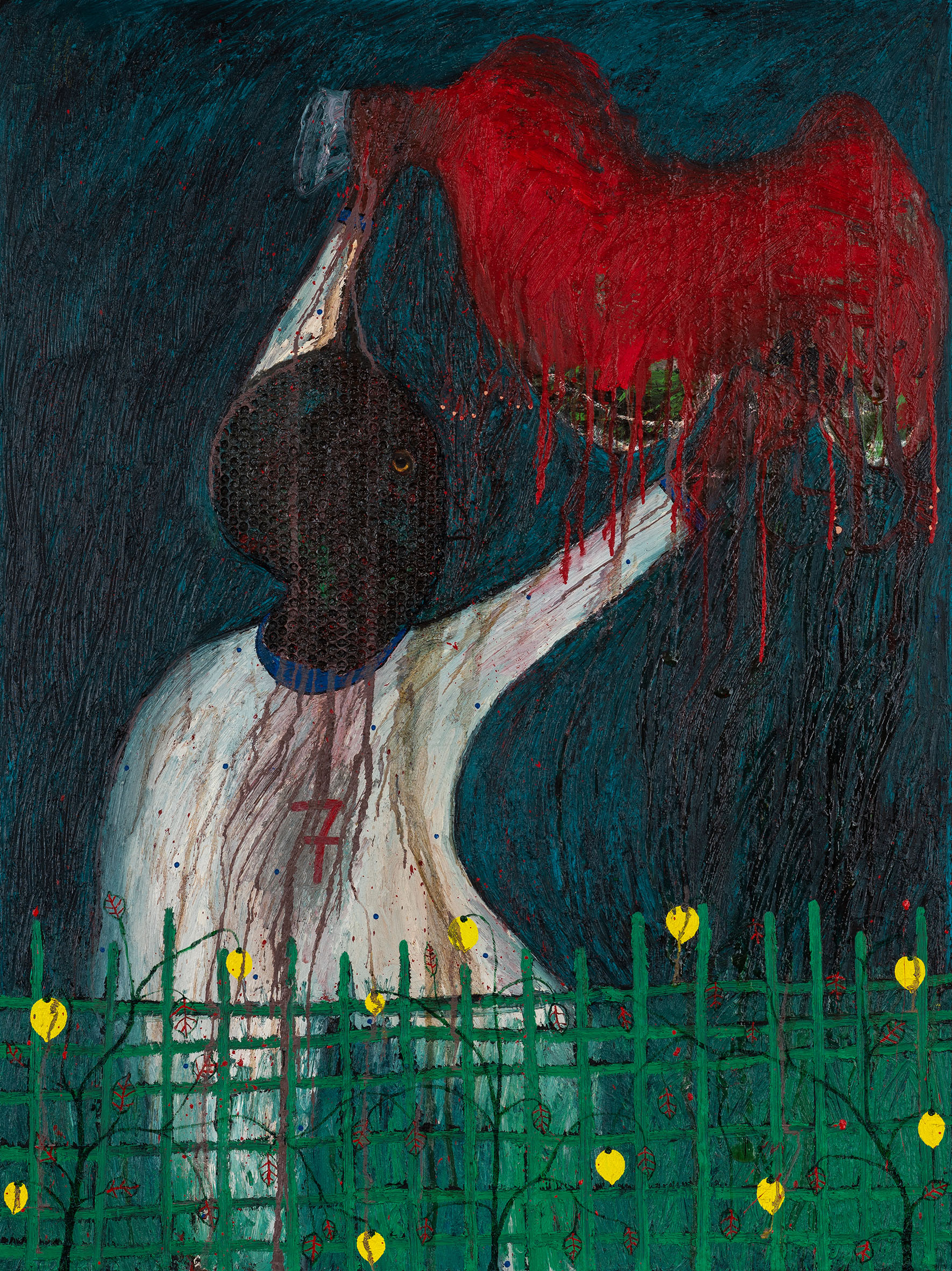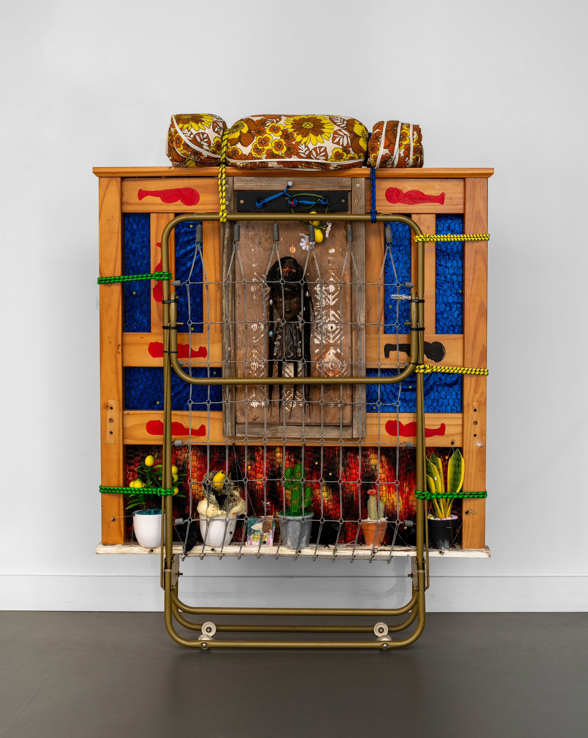 mixed media on paper mounted on side of found baby cot