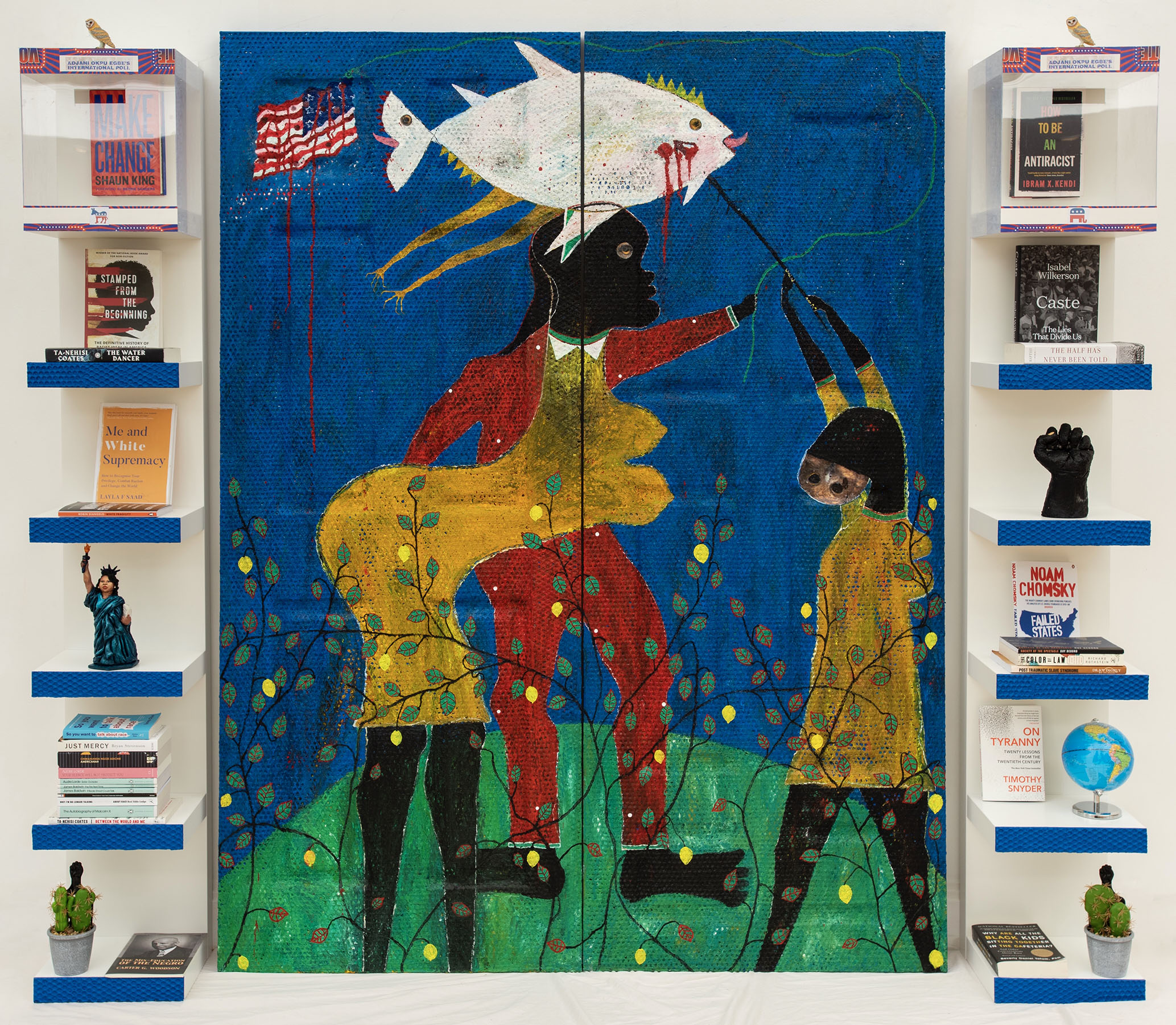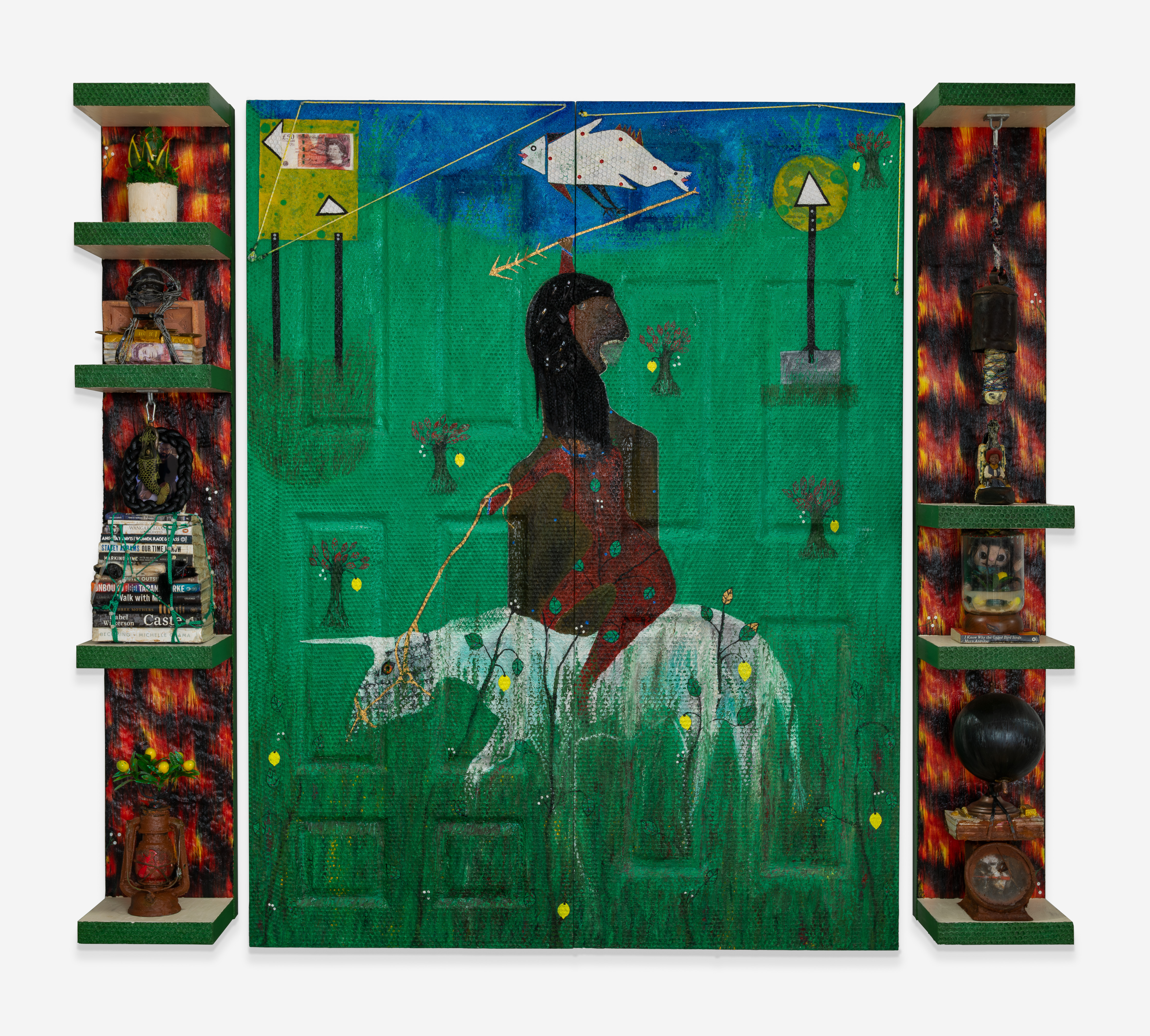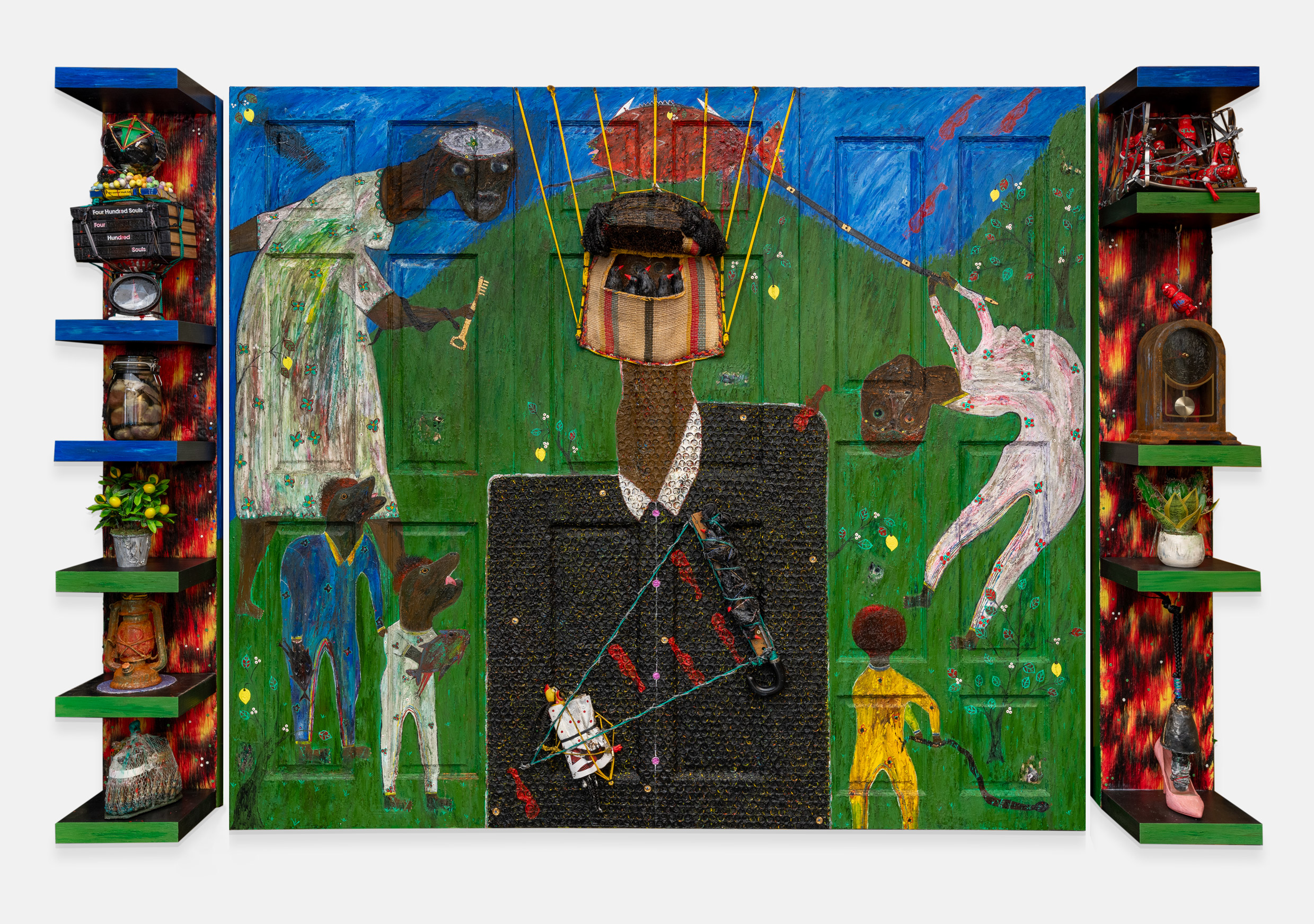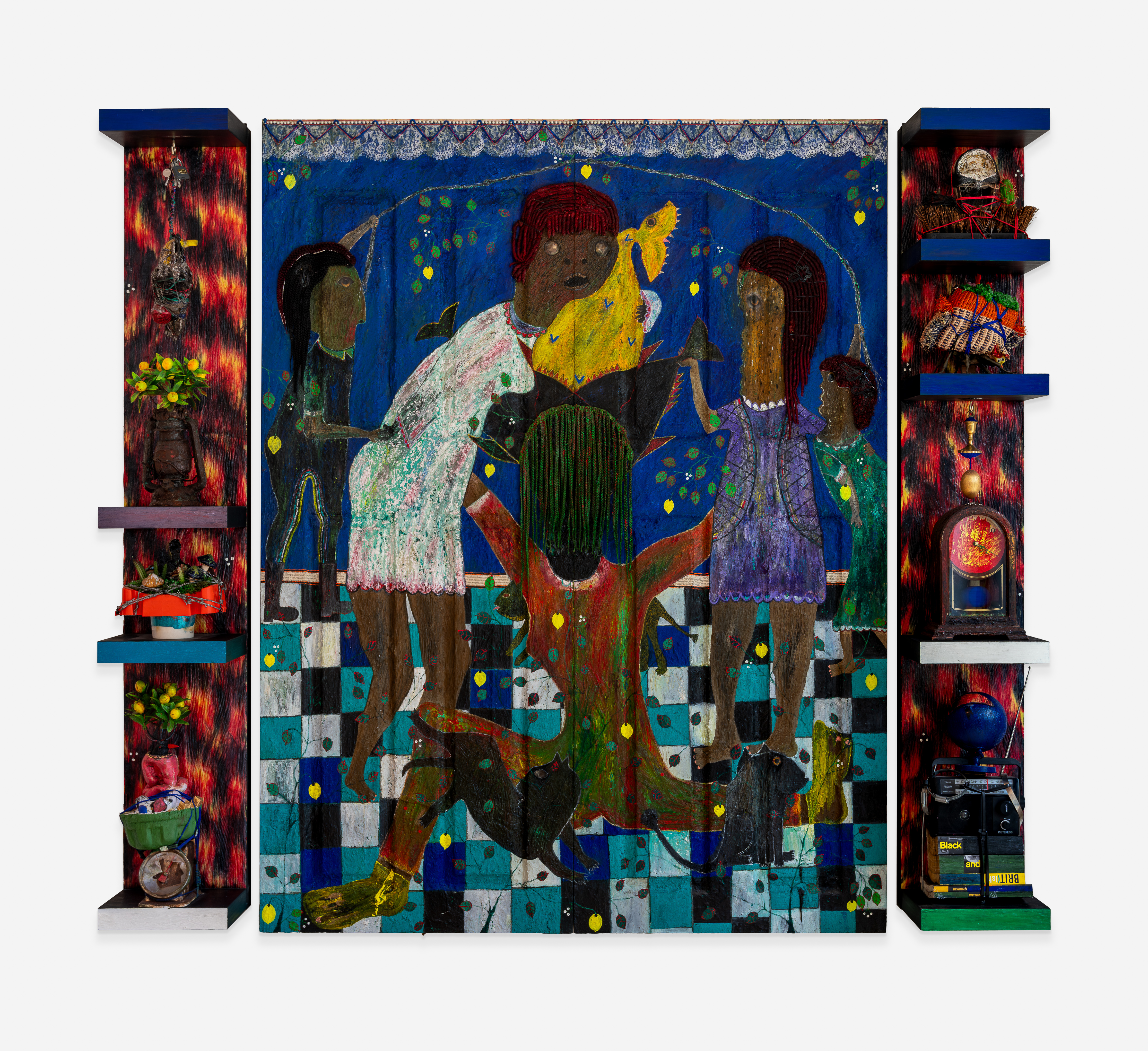 quadriptych multimedia installation with 2 door panels 2 shelves and variable sizes of found and customized objects