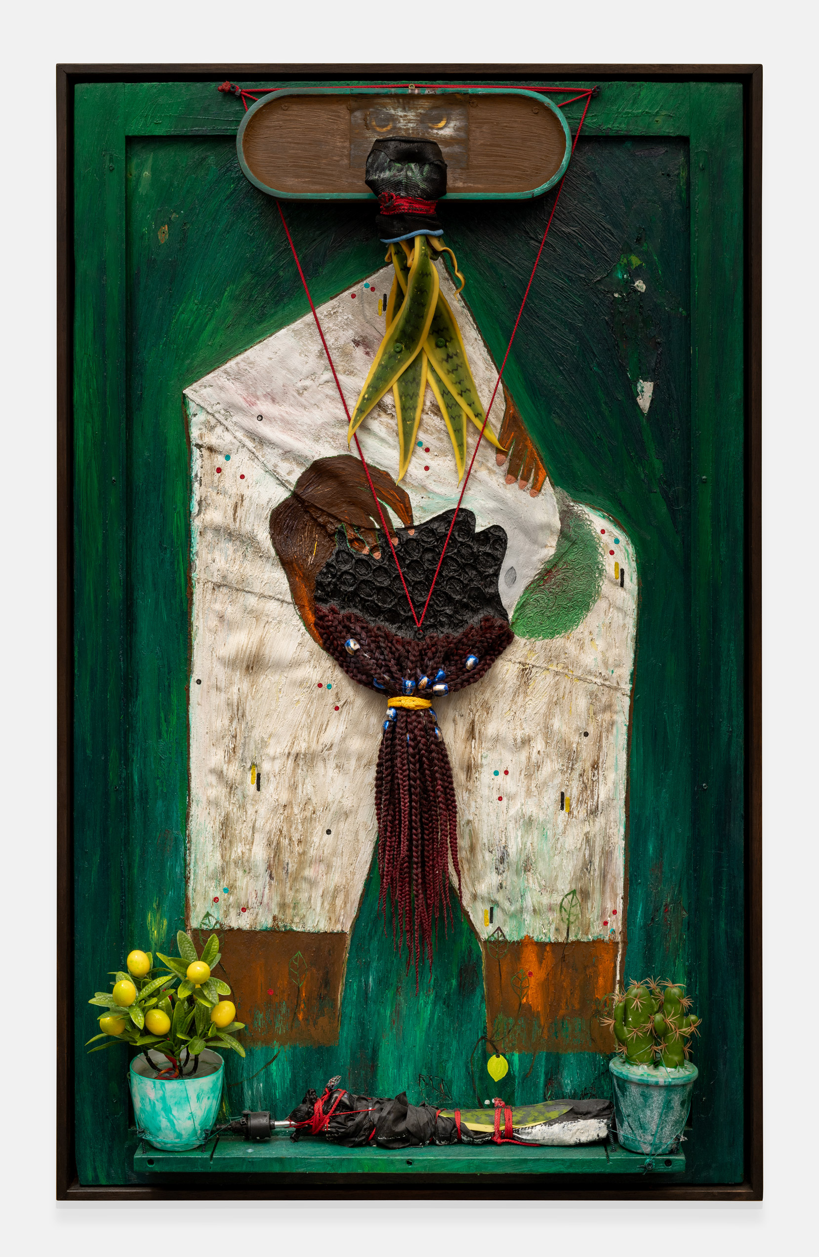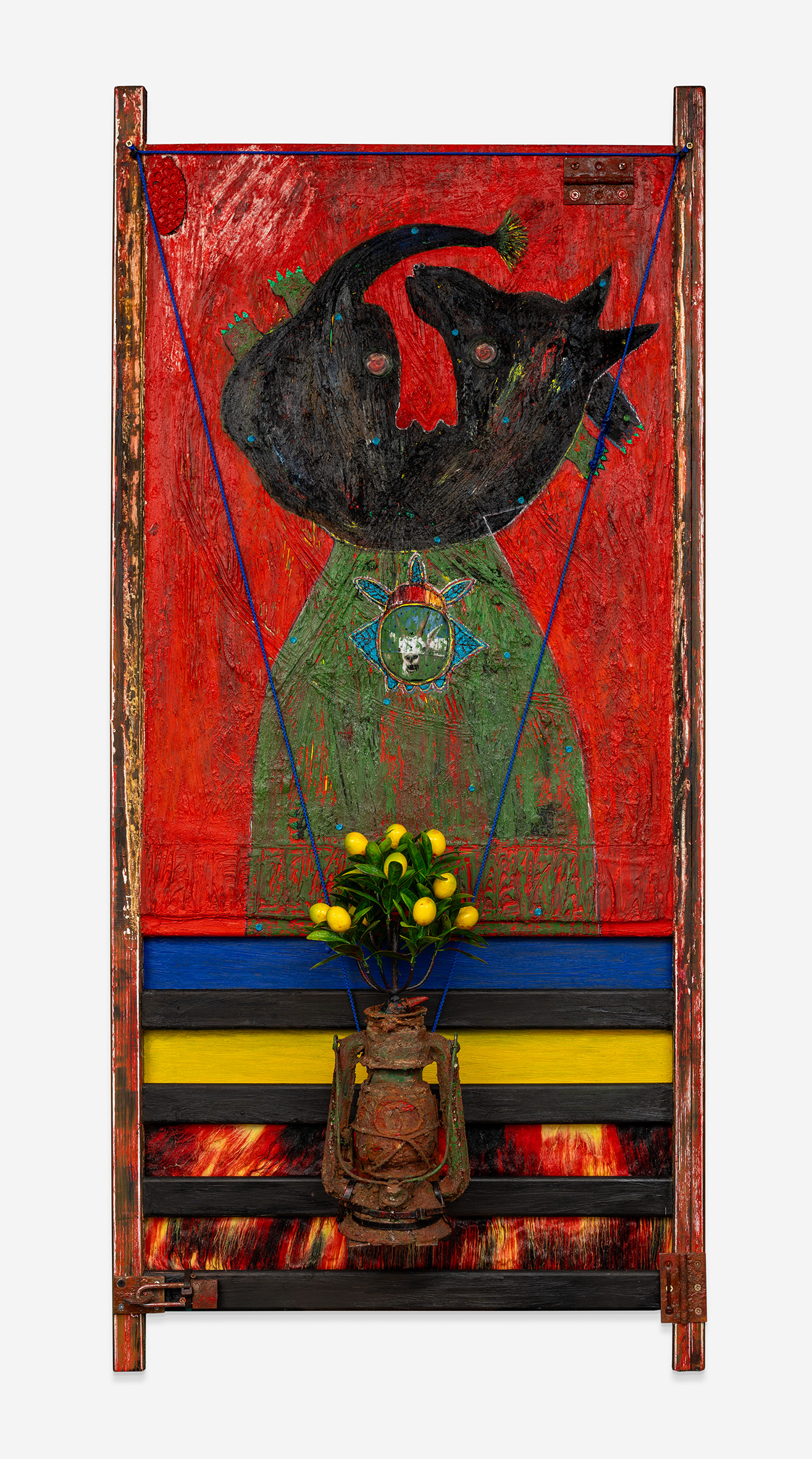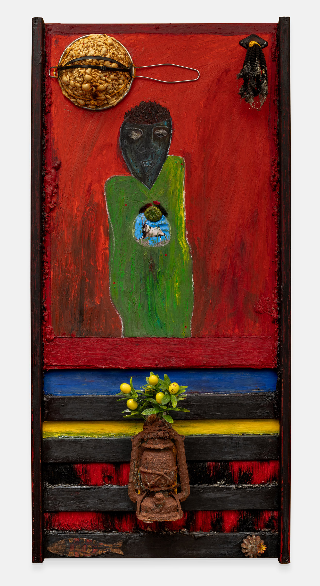 mixed media and various found objects on found board