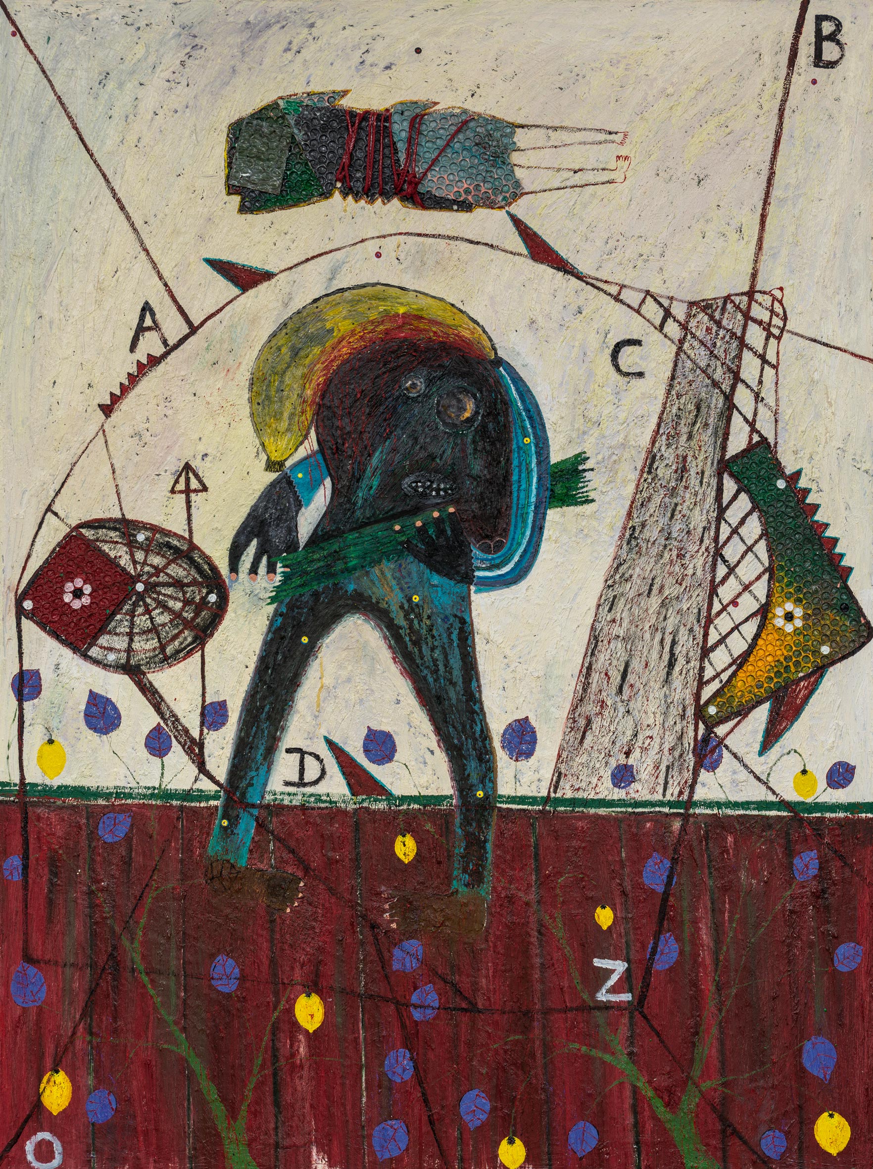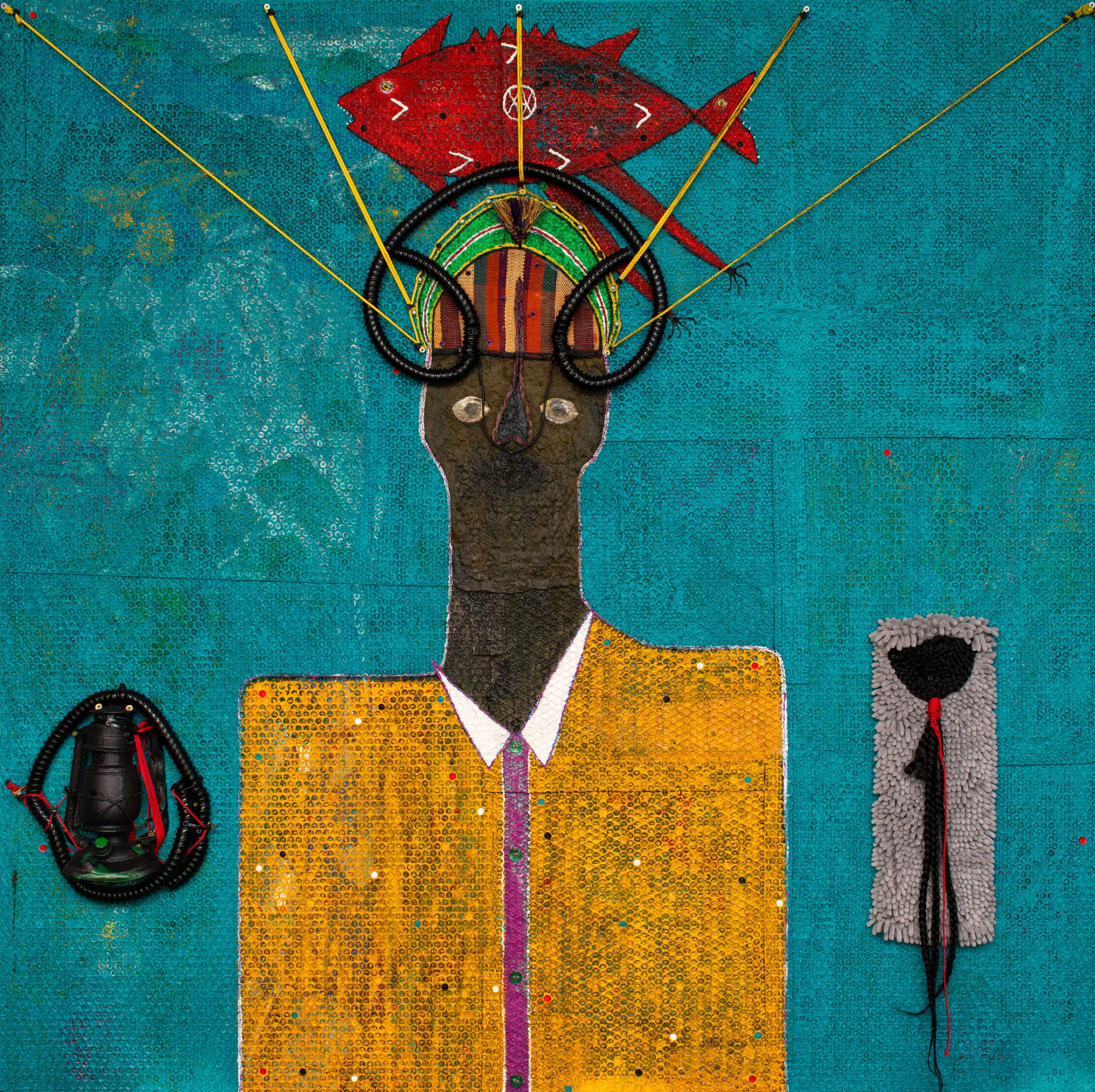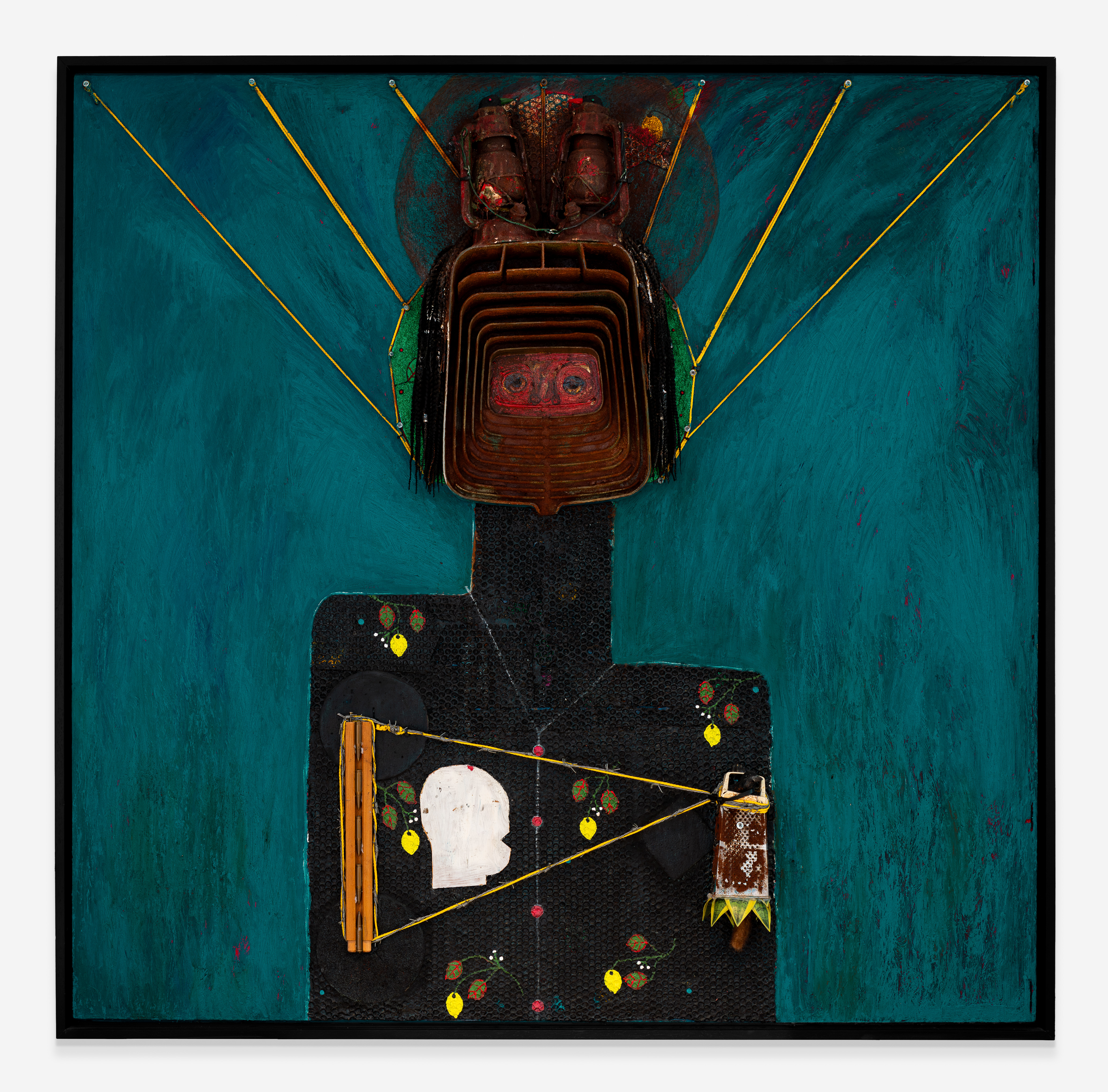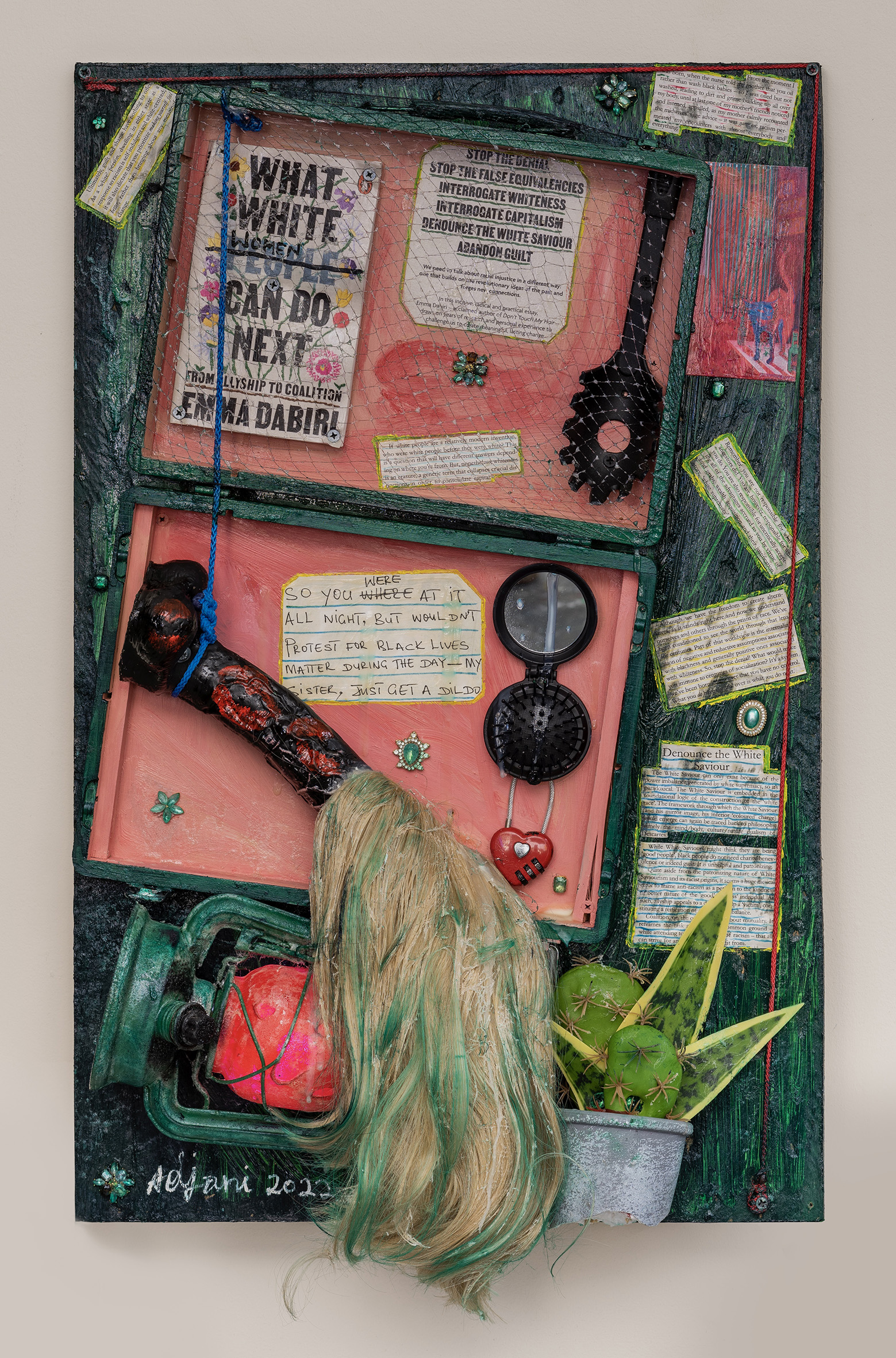 mixed media and various found objects on found board